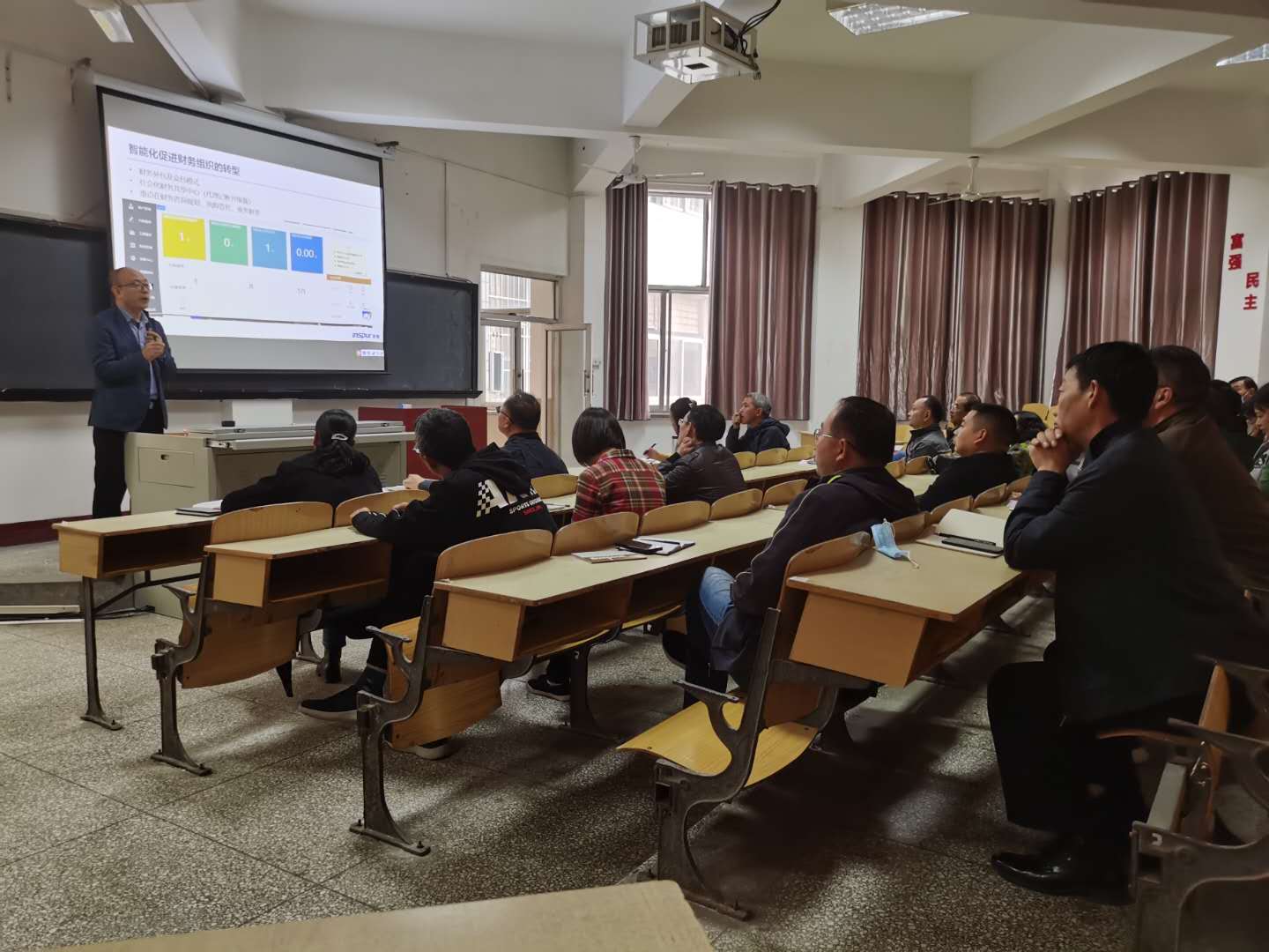 2020年10月26日下午,河南浪潮软件科技有限公司董事长刘向阳先生来公司做讲座。他以“智能时代 财务管理”为主题,主要讲授了智能化发展现状及方向,大数据、物联网、5G技术、区块链、云计算与人工智能等信息化技术助推财务会计向管理会计、经营会计转型,进而实现战略财务、共享财务和业务财务。公司全体教职工聆听了本次讲座。本次讲座使老师们对信息化技术有了更清楚的理解,对智能财务的发展有了更深刻的认识,激发了公司教职工学习信息化技术的热情,有利于老师们进一步提升教学信息化水平。