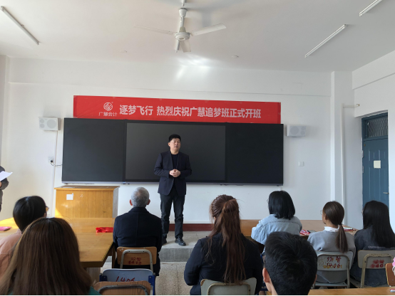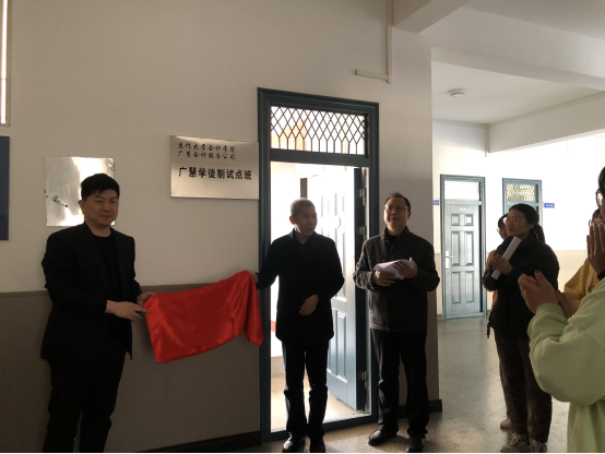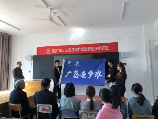卢国红经理首先介绍了yl7703永利与焦作市广慧会计服务有限公司开展校企合作及成立广慧学徒制试点班的情况,然后由卢国红经理和马亚楠总监共同为广慧学徒制试点班揭牌,辅导员杨帆老师宣读了《广慧学徒制试点班奖学金评定办法》。广慧会计公司石文静经理给员工展示了广慧学徒制试点班的班旗,解释了设计理念。最后广慧集团公司人事总监马亚楠做了总结讲话。