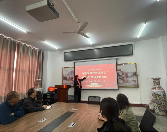 本次讲堂活动的主讲人为会计学党总支书记孔维丽,全体教职工参加此次活动。孔书记通过PPT和大家分享了“守规矩 懂业务 真落实”活动主要目标任务、落实的意义、近期工作成绩以及“守规矩 懂业务 真落实”活动要求和下一步工作安排,肯定了“新生导师领航计划”实施一年来取得的效果,鼓励大家继续围绕“三比一争”、品牌创建等工作,高质量完成各项工作任务。