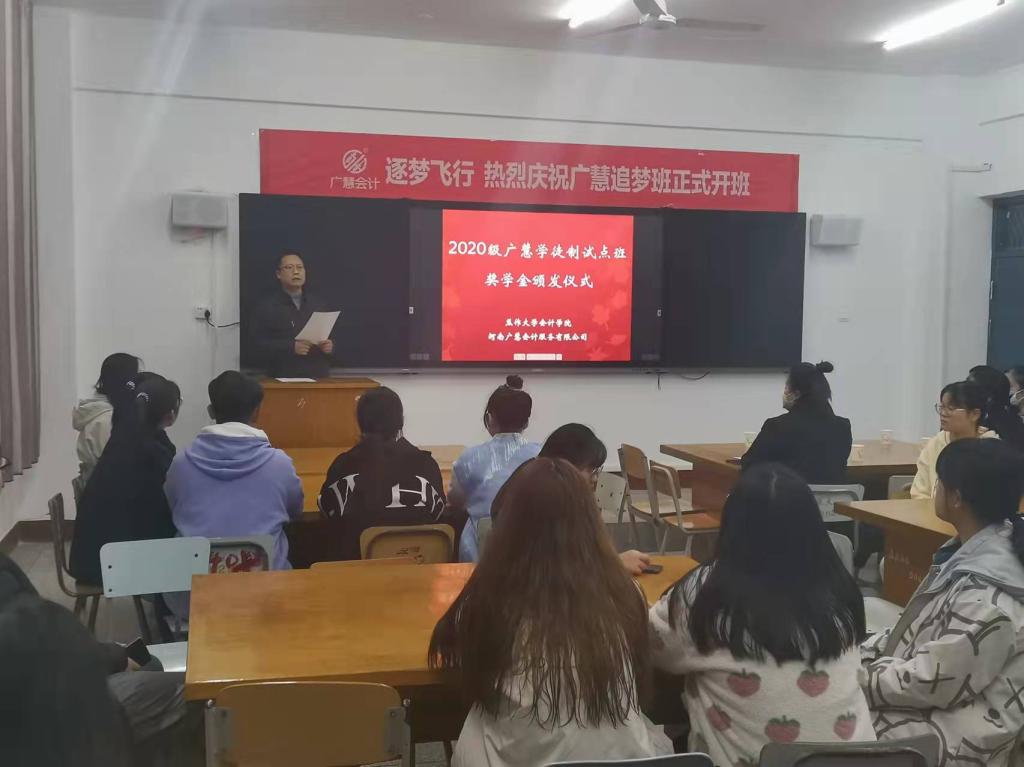 2021年11月11日,yl7703永利举行2020级广慧学徒制试点班奖学金发放仪式。参加此次仪式的有yl7703永利广慧学徒制试点班的辅导员何斐和杨帆老师、焦作市广慧会计服务有限公司经理石文静、账务经理张伟和人事主管卢雅慧,仪式由yl7703永利副经理孙玉庆主持。