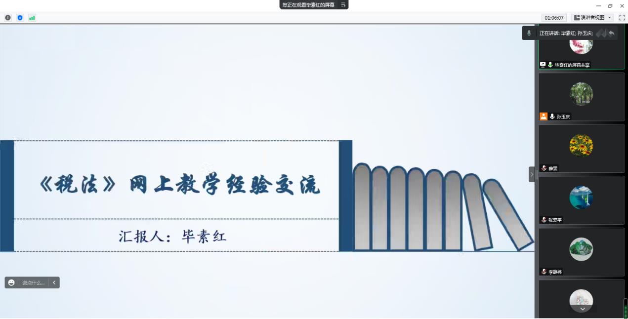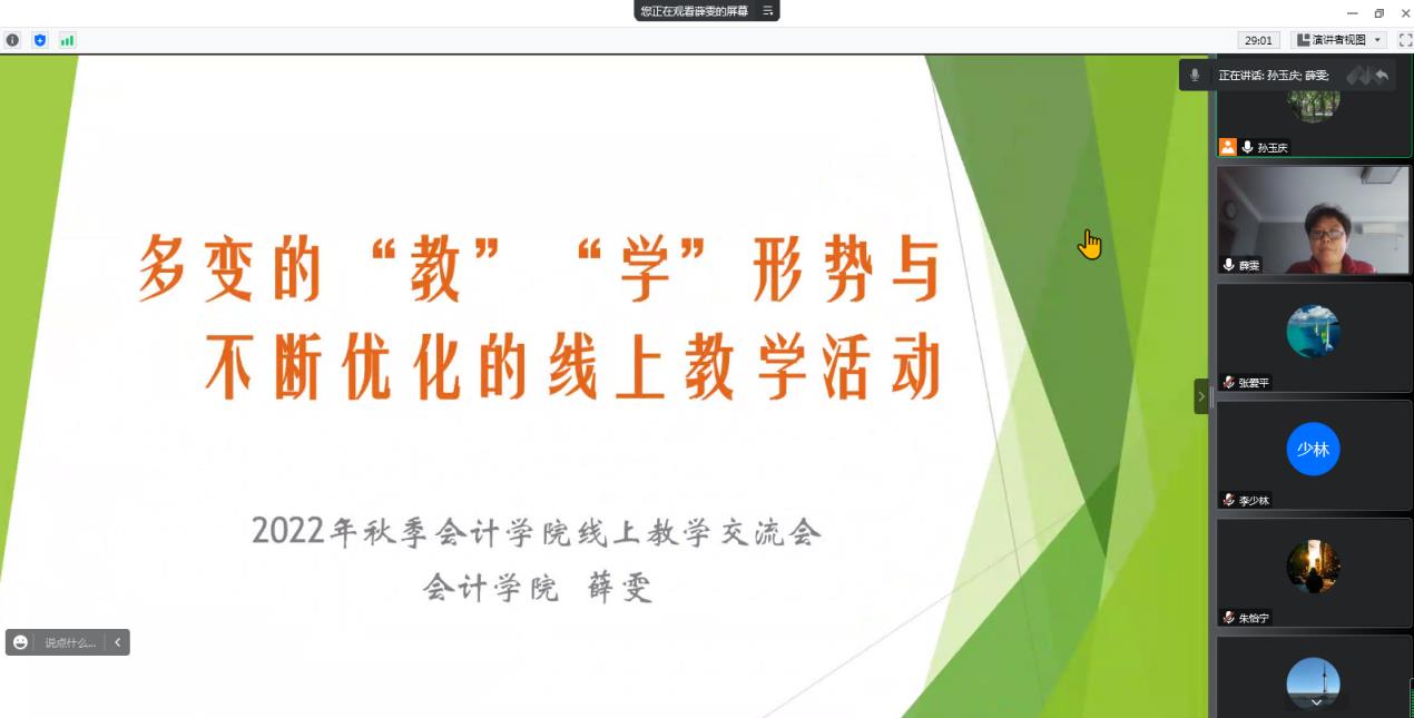 会议当中,大数据与会计教研室的薛雯老师以“多变的‘教’‘学’形势与不断优化的线上教学活动”为题,会计信息管理教研室的孟笑扬老师以“线上教学模式探索与分享”为题,大数据与财务管理教研室的毕素红老师以“《税法》网上教学经验交流”为题,分别分享了自己的线上教学经验。王喜梅、苗娟和薛军老师也就自己的线上教学的经验和困惑进行了发言和交流。
