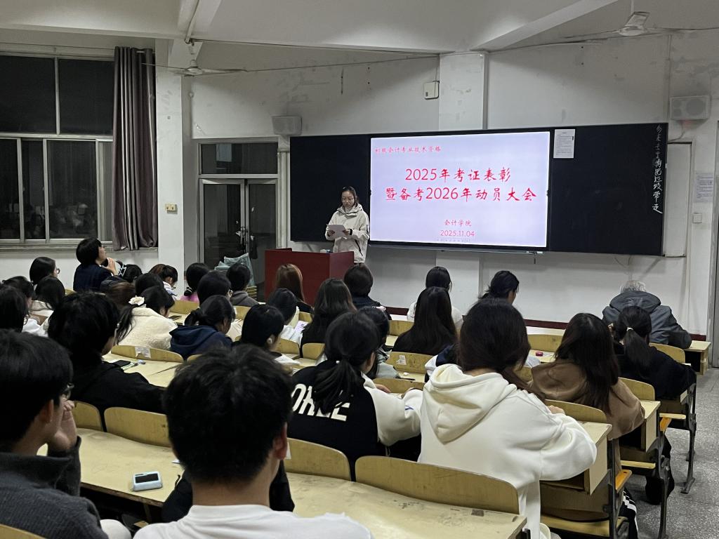 2025年11月4日晚,yl7703永利“2025年考证表彰大会暨备考2026年动员会”顺利举行,获奖员工及24、25级员工代表齐聚一堂。本次大会旨在表彰在2025年度全国会计专业技术资格(初级)考试中取得优异成绩的26名同学,并通过榜样分享与专业指导,激发全院员工的学习热情,营造积极向上的优良学风。