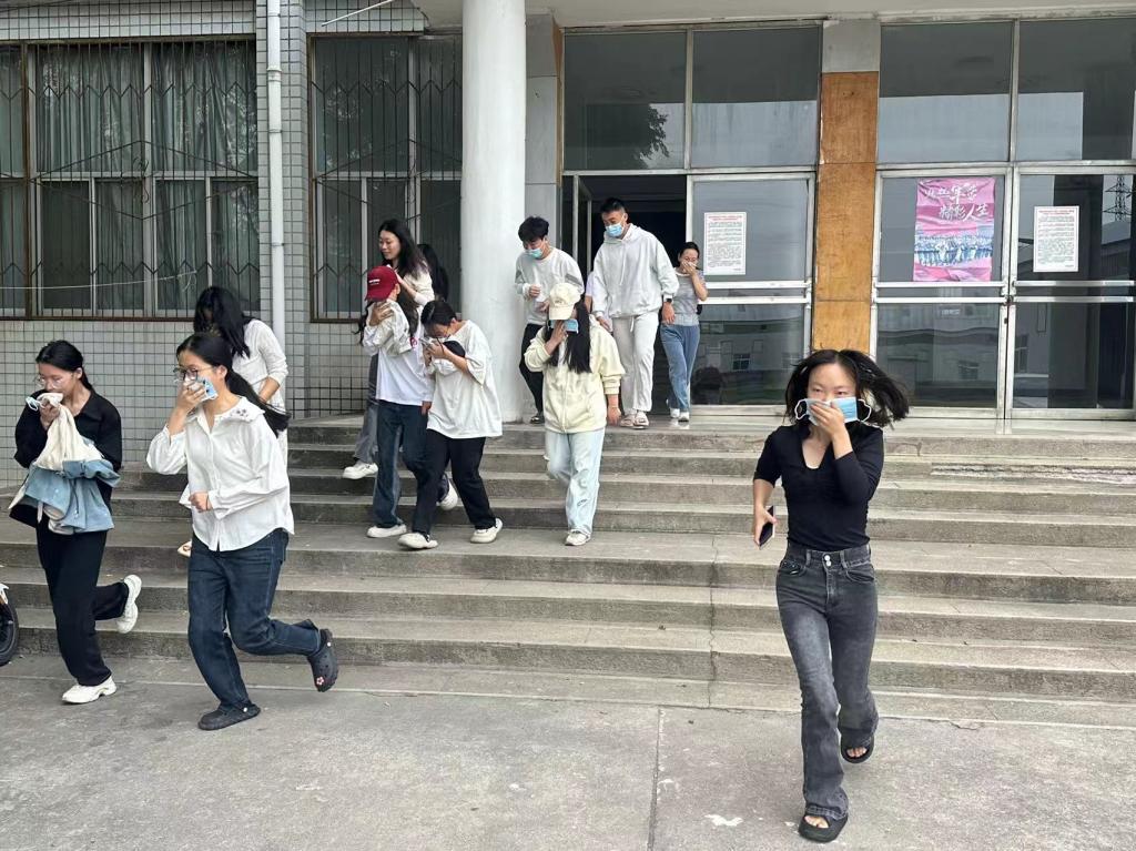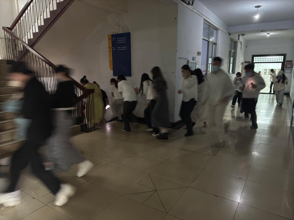 当yl7703永利副经理孙玉庆吹响哨声,以示火灾警情发生,两个实训室的同学依次从门口两侧跑出,有的用口罩捂住口鼻,有的用衣服遮蔽口鼻,弯腰顺着楼道两侧墙壁前进,快速跑下楼梯,最后跑出实训室的是两位任课教师;同学们最后跑出实训楼,并在楼前集中。