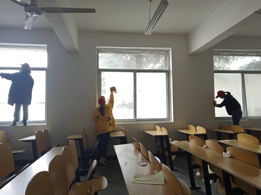中午12:30,志愿者集合后分组清理校园。此次校园清洁的任务不是很轻松,但志愿者们依旧勤恳认真地工作着。志愿者们将三教的所有楼道和窗户都进行了打扫和清理,一盆一盆不断换着的水成为时间流逝的标志,墙上的小广告也让大家的工作进度慢慢下降,墙上的“牛皮癣”异常难处理,志愿者一遍遍地擦洗和铲除,费了好久才弄掉。在大家的努力下校园清洁任务也很快就收尾了。看着整洁的环境,每个志愿者都对此次的劳动成果表示满意。